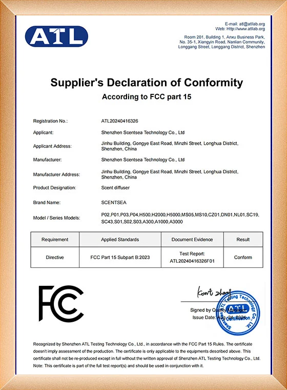 Kaikilla SCENTSEA:n tuoksuhajottimilla on CE-, ROHS-, FCC- ja SGS-sertifikaatit. Tähän mennessä SCENTSEA:n tuoksukoneet on asennettu yli 70 maahan ja ovat saaneet asiakkaidemme suosiota.